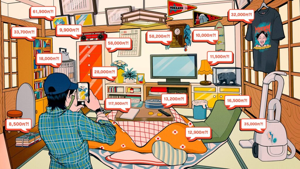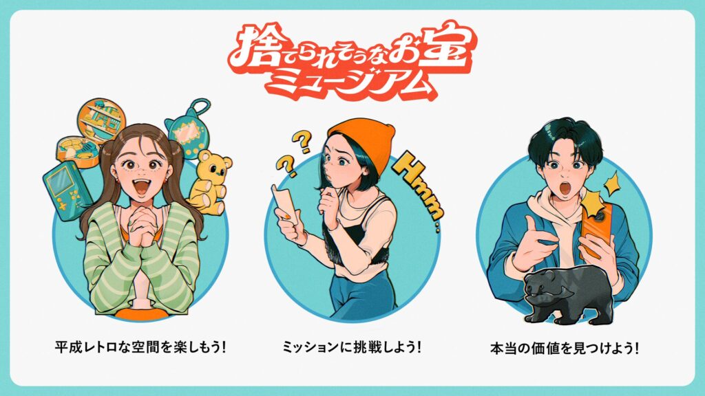 メルカリ 体験型施設「捨てられそうなお宝ミュージアム」のメインビジュアル、楽しむ為の3STEPイラスト、館内イメージパースイラストを担当しました。